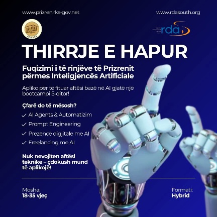 Komuna e Prizrenit, në bashkëpunim me Agjencinë për Zhvillim Rajonal Jug (RDA South), ka hapur aplikimet për fazën e dytë të Bootcamp-eve të Inteligjencës Artificiale, që do të zhvillohen nga shtatori deri në dhjetor 2025.
