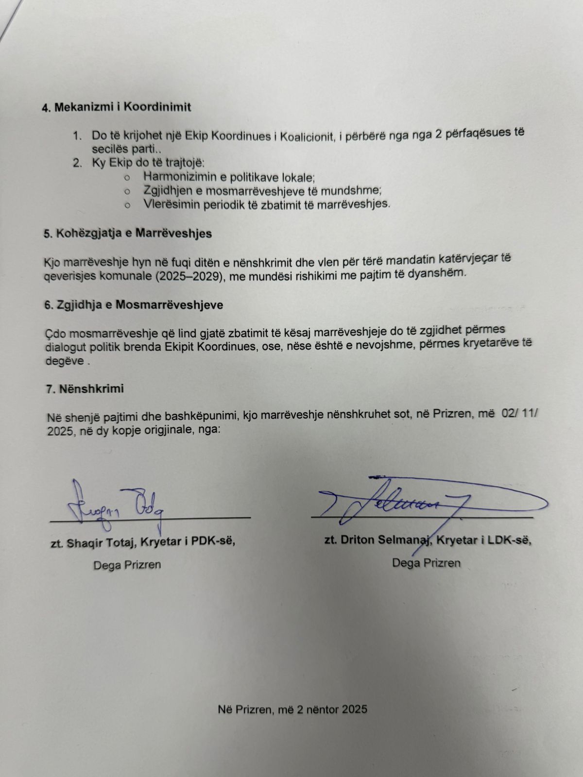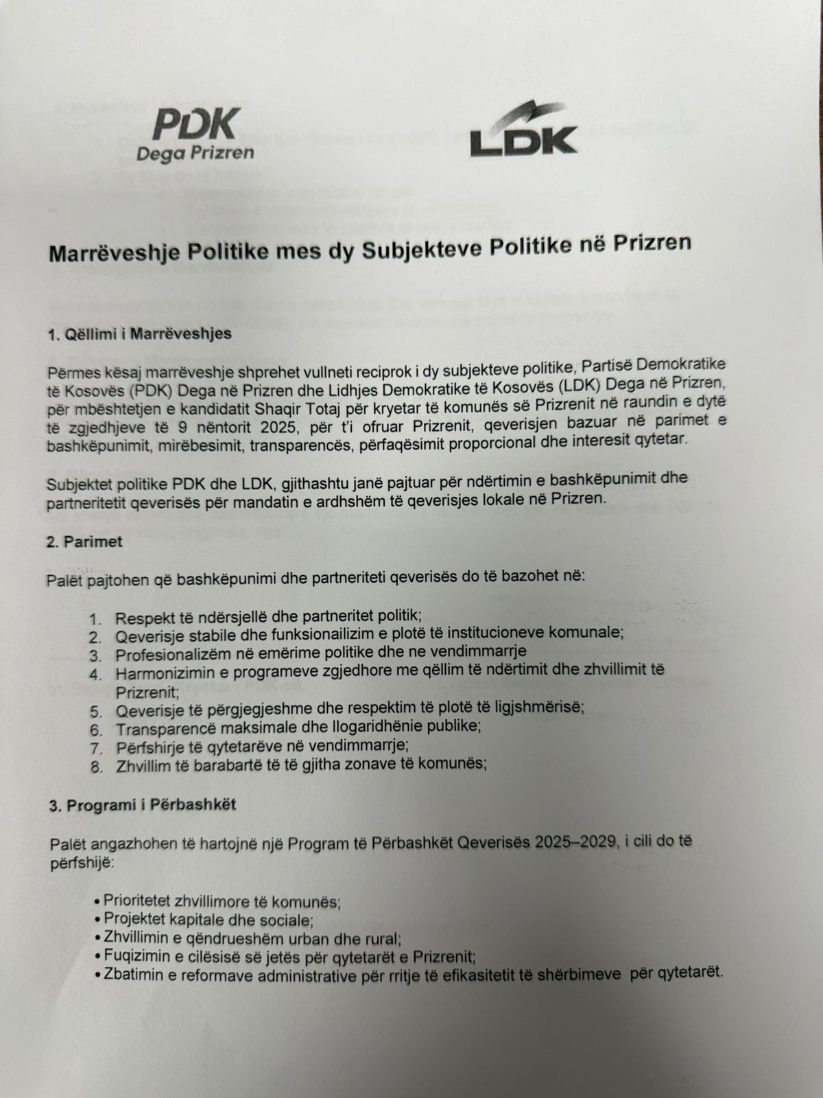 Burime të TV Prizrenit kanë siguruar kopjen e marrëveshjes së këtij koalicioni, në të cilën parashihen pikat kryesore të bashkëpunimit ndërmjet dy subjekteve politike në raundin e dytë të zgjedhjeve lokale.