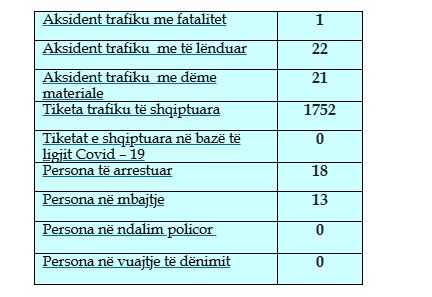 Sipas raportit të Policisë, një aksident ishte me fatalitet, 22 me të lënduar dhe 21 aksidente me dëme materiale. Njëherësh janë shqiptuar edhe 1 mijë e 752 gjoba trafiku, janë arrestuar 18 persona e 12 janë dërguar në mbajtje.
