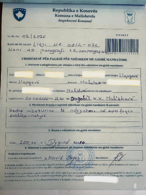Së fundmi, një qytetar nga Llapçeva është gjobitur me 200 euro, pasi kishte hedhur mbeturina në një hapësirë publike në fshatin Dragobil.