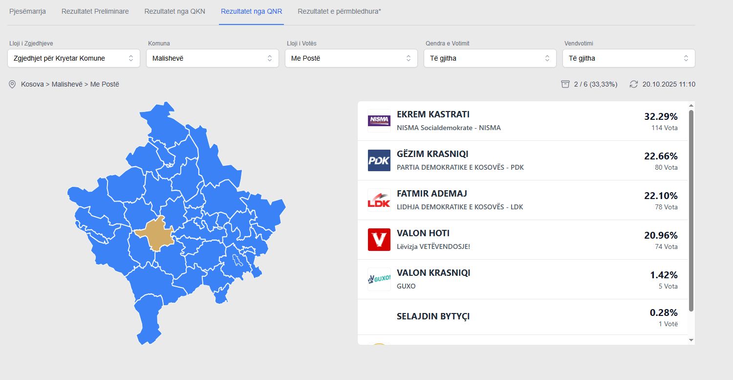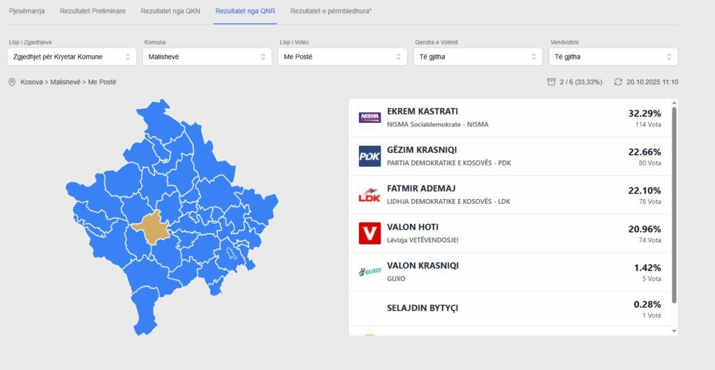 Deri më tani janë numëruar 33.33% e votave me postë, ku Kastrati i Nismës, ka grumbulluar 32.29% te votave, e pas tij renditet Gëzim Krasniqi i PDK-së, i cili ka marrë 22.66%, transmeton Klankosova.tv.