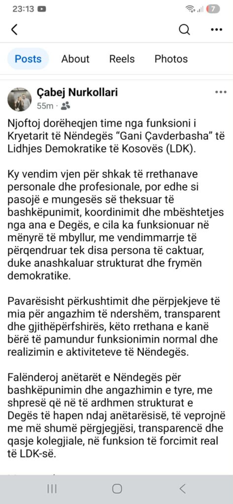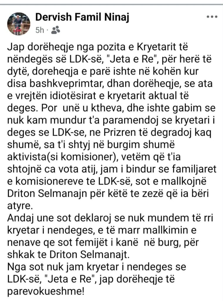 “Nga sot nuk jam më kryetar i nëndegës së LDK-së ‘Jeta e Re’. Jap dorëheqje të parevokueshme”, njofton ai./PrizrenPress.com/